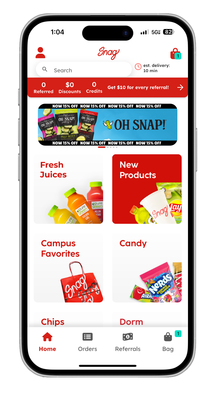 Snag is a delivery service designed for the fast-paced life of college students, and I’ve had the opportunity to help shape how the brand communicates across digital platforms. At Snag, I’ve contributed to multiple areas of design, from building web pages that reflect the brand’s voice to crafting eye-catching app banners that drive engagement. I also lead the creation of their slide deck presentations, turning big ideas into clear, compelling visuals for pitches and internal strategy. Working with Snag has allowed me to blend creativity with function and bring fresh energy to a growing company in a space I know well- college life