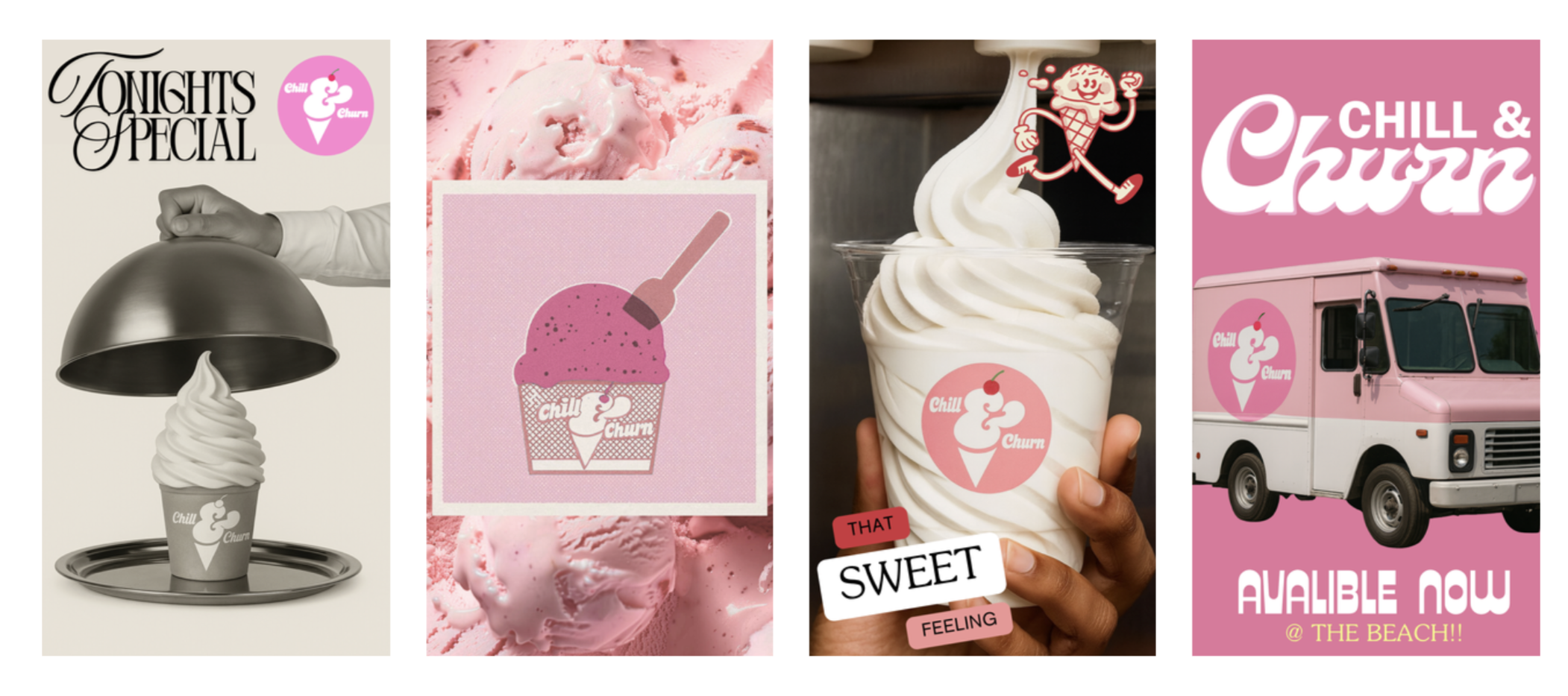 For this project, I created an original brand called Chill and Churn, a California-based ice cream company inspired by the state’s laid-back, beachy vibe. I developed the logo and brand story, which traces its roots from colorful ice cream trucks to a beloved storefront. With small-batch, high-quality ingredients, Chill and Churn captures the carefree spirit of California in every scoop.